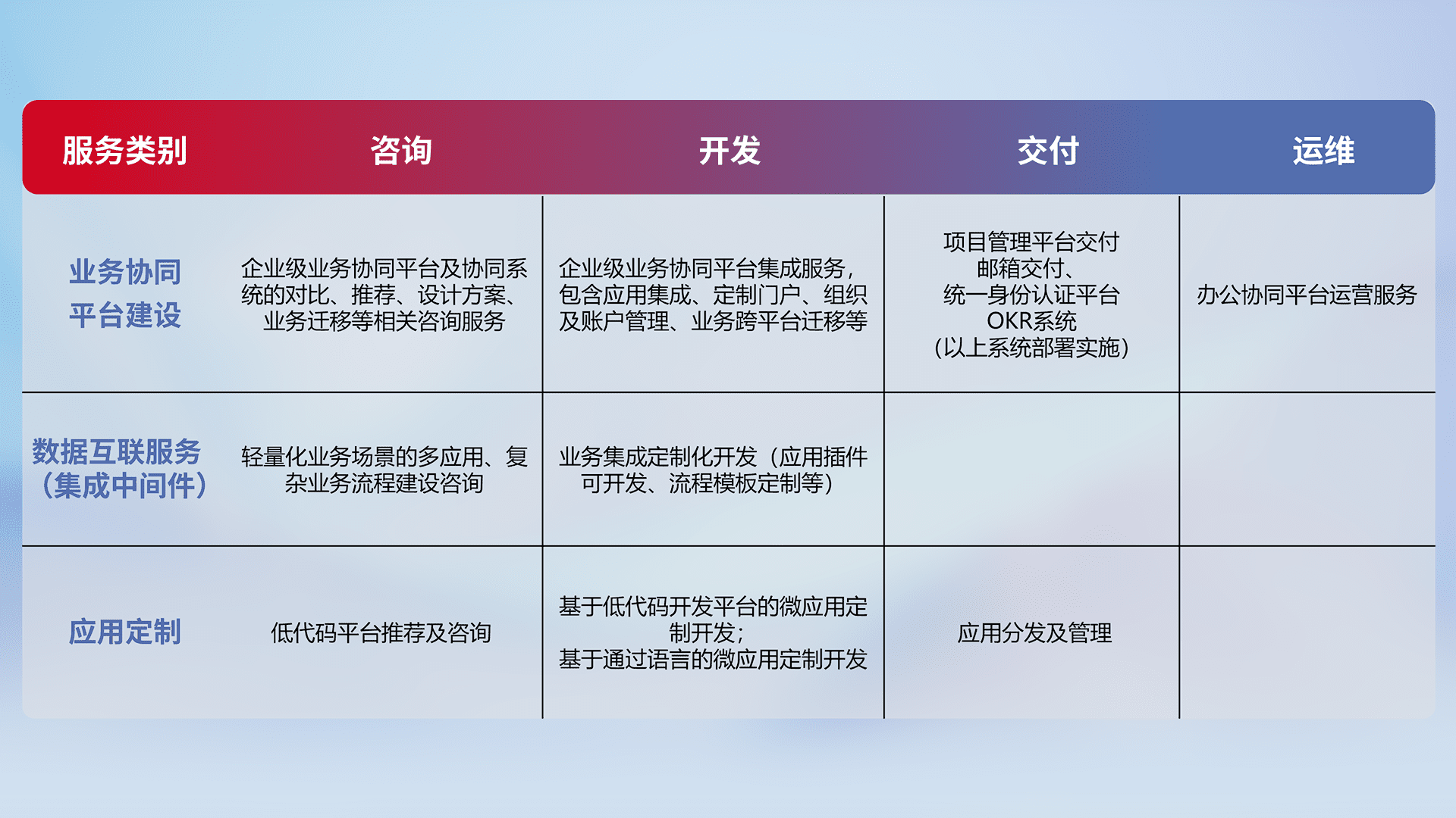 针对钉钉、、、、企微、、、IDaas等平台级产品提供产品的规划、、、、方案、、交付、、、定制化开发等服务,,,,实现如统一协同办公、、、、智能客户服务、、、混合会议管理、、智能数据查询、、等业务场景,,实现数字化转型。。。。