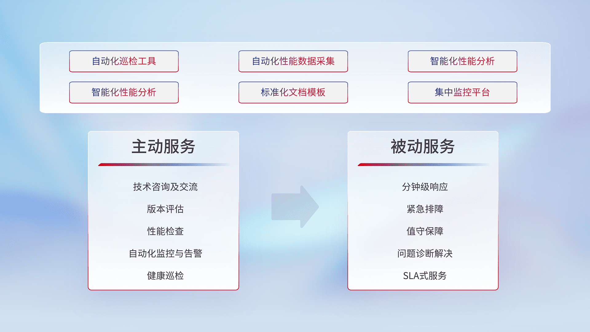 智能化工具和标准化文档,,保障服务质量,,,提供主动服务(包含技术咨询、、、版本评估、、性能检查、、自动化监控与告警、、、、健康巡检)和被动服务包含(分钟级响应、、、紧急排障、、、值守保障、、、问题诊断解决、、SLA服务)。。。。